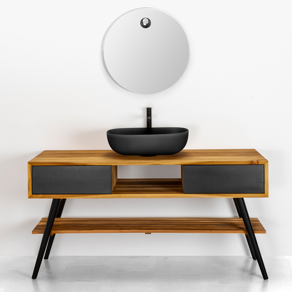 Badezimmermöbel-Komposition mit Unterschrank aus naturbelassenem wiedergewonnenem Teakholz, komplett mit 2 praktischen Schubladen aus Mahagoniholz , schwarz lackiert in der gleichen Farbe wie die Beine und Stützzubehör, handgefertigt in Italien aus feuerfestem Ton und dunkler Erde mit glänzend schwarz emailliertem Innenraum.   Dieses Zubehör zeichnet sich durch Details wie das Neoprenpolster aus, um den Schutz der Stützfüße zu gewährleisten, und den Spender mit mattschwarzem Metallspender , um eine optimale Seifenabgabe zu gewährleisten.