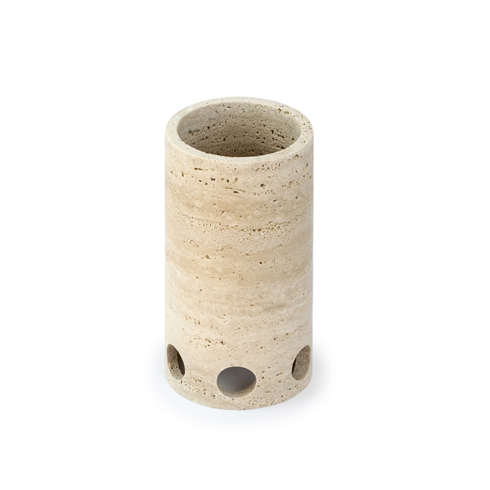 Die zylindrische Form der Vase mit zarten geometrischen Öffnungen ist nicht nur ein ästhetisches Detail, sondern dient auch dazu, das sanfte Licht einer Kerze zu streuen und so eine einladende und entspannende Atmosphäre zu schaffen. Indem man die Struktur umdreht und einfach eine Pflanze hineinstellt, verwandelt sie sich in eine elegante Vase , die einen Hauch von Grün in Ihr Zuhause bringt.